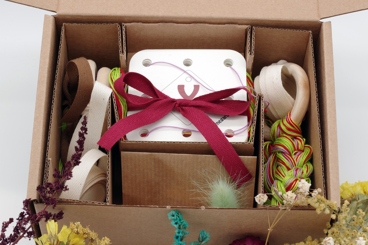 - 3 puidust rõngast (2+1), mille külge on kinnitatud lõimelõng;