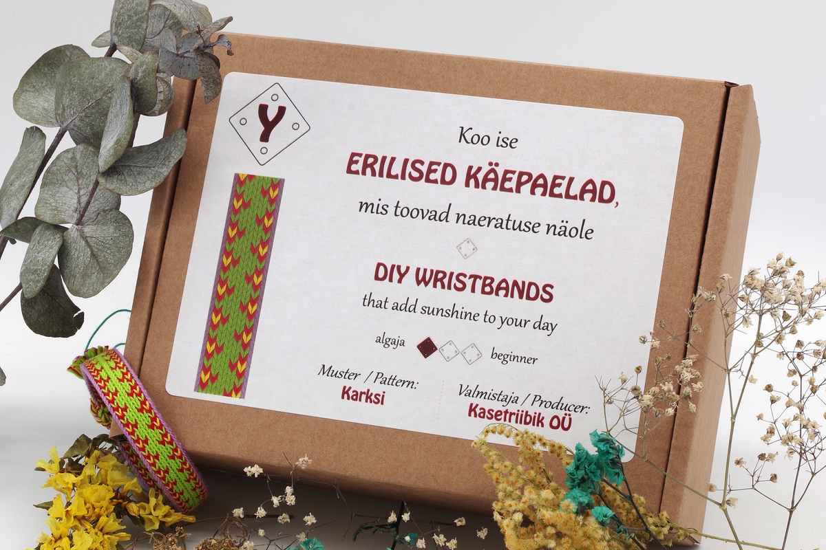 Kompaktsest karbist leiad kõik vajaliku kahe samasuguse mustriga käepaela kudumiseks: