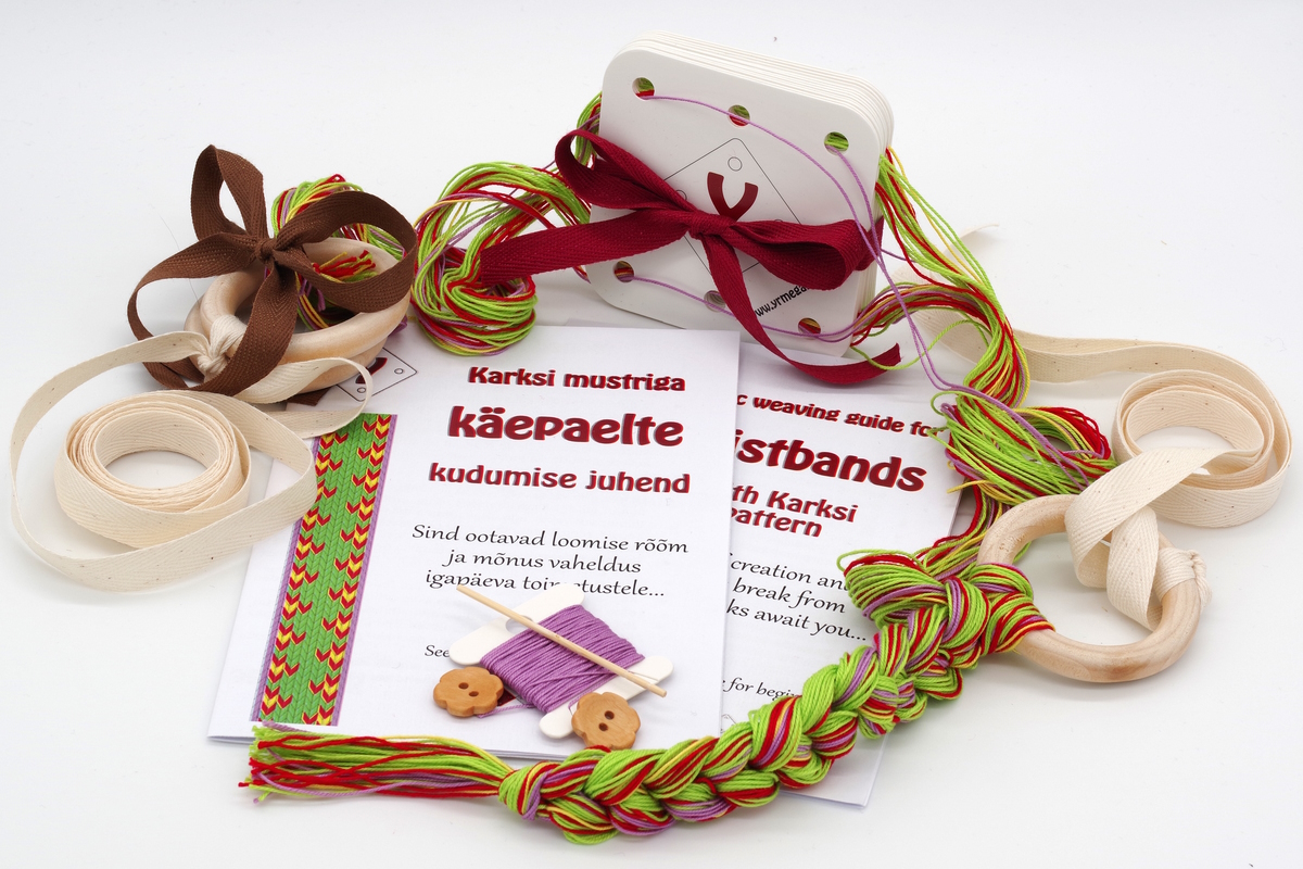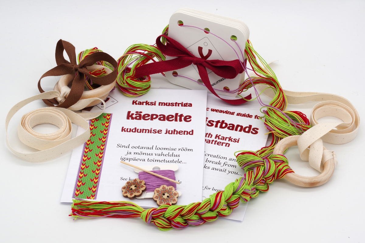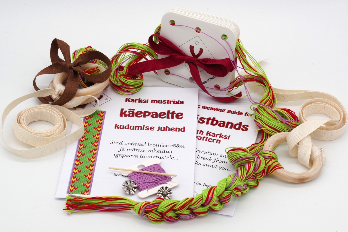 Komplektide valmistamiseks kasutame ainult kvaliteetseid ja võimalikult looduslikke materjale. Karksi mustriga käepaelte kudumise komplektis on kasutatud puuvillaseid heegelniite.